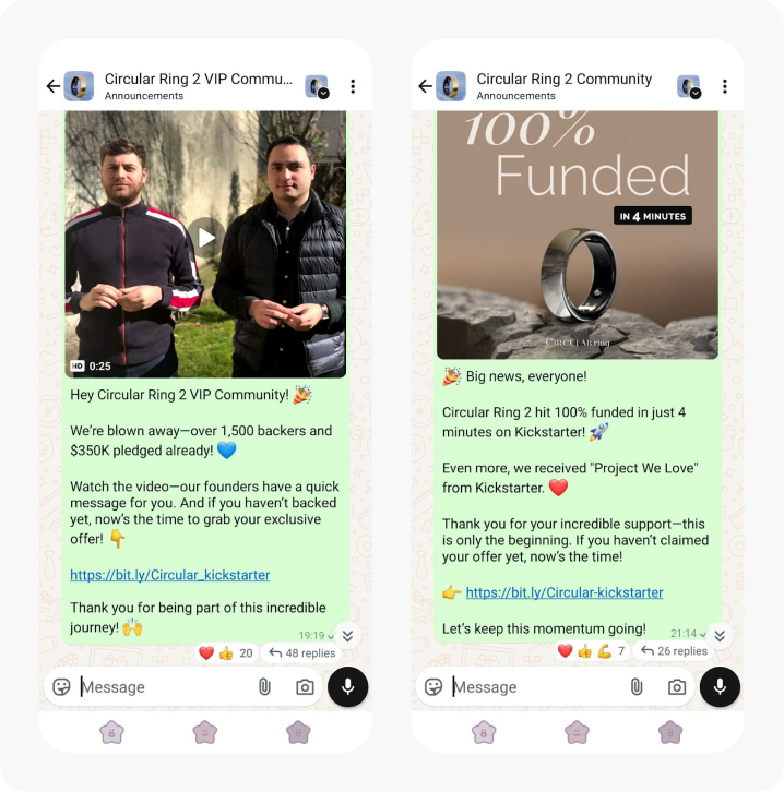 Circular Ring 2 successfully raised more than $4M and garnered close to 10,000 enthusiastic backers. Our strategic social media and proprietary WhatsApp approach fundamentally shifted perceptions, transforming initial skepticism into overwhelming community support and a remarkable crowdfunding triumph.