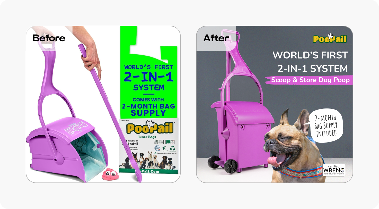 - Reset the visuals to match the truth → We organized a photoshoot that placed Poopail where it belonged: in homes, on patios, and in gardens, not on sidewalks. Because on Amazon, visuals aren’t decoration; they are the first line of positioning.